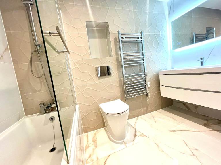 The bathroom features stylish white sanitaryware with chrome fittings, wall hung vanity wash hand basins with Monobloc cascade mixer taps, wall hung WCs with dual push button flush, large fitted mirrors, tiled panel enclosed baths with overflow bath filler, thermostatically controlled shower, tempered glass fitted shower screen and fully tiled walls and floors.