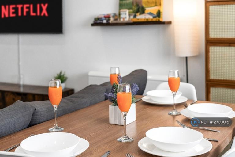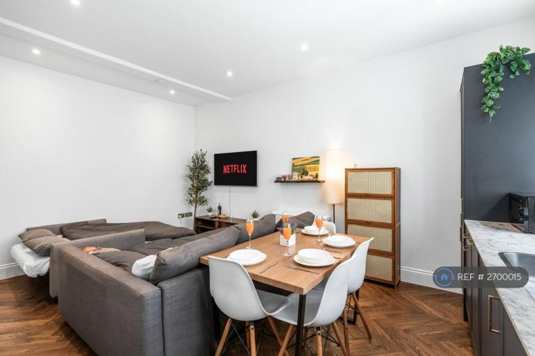 The apartment features designer interiors with dark navy kitchen, marble backsplash and luxury marble bathroom. Clever sofa bed arrangements allow flexible accommodation for up to 6 guests, making it perfect for professionals, couples or small groups requiring quality temporary housing.