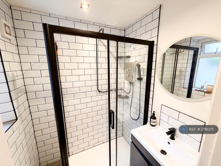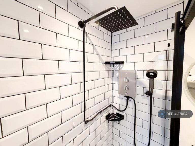 The recently refurbished bathroom features a sleek walk-in shower and a stylish modern aesthetic, creating a fresh and relaxing space.