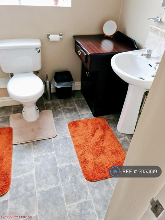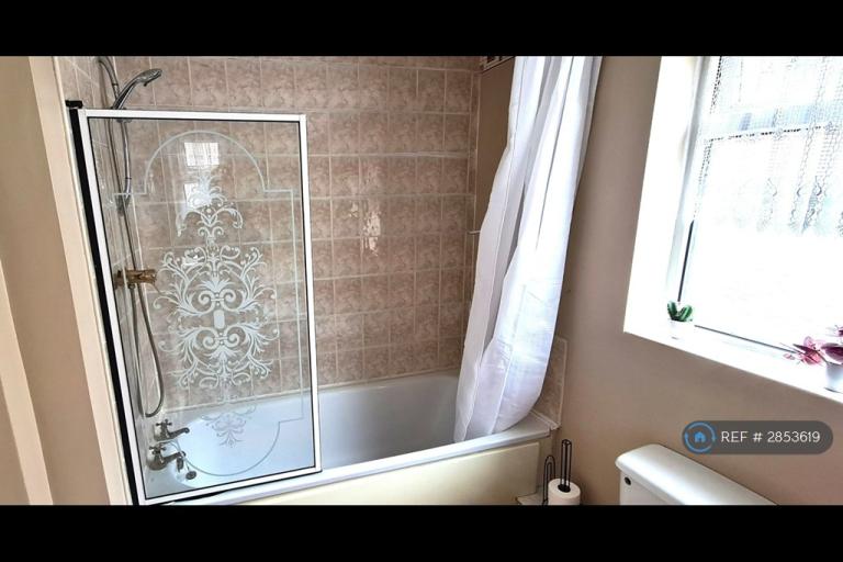 - Bathroom with shower over bath, toilet, and wash hand basin