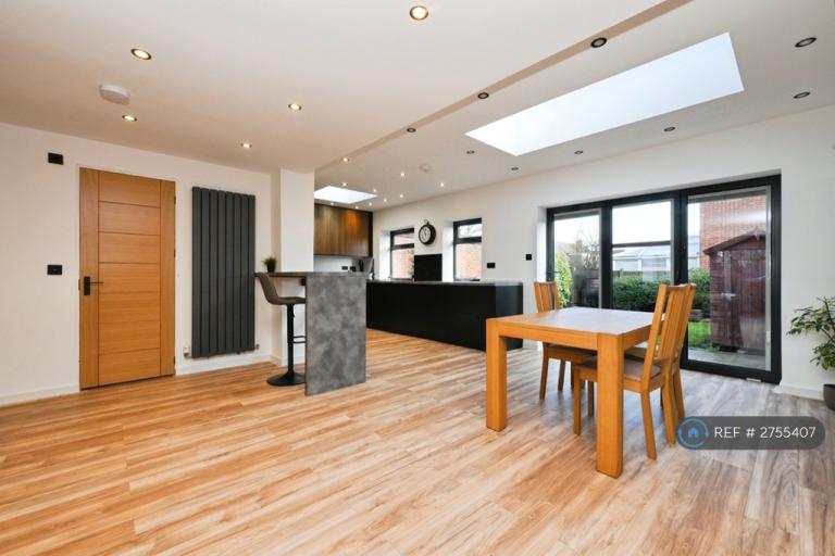 Laminate flooring throughout, with tiles in the kitchen and bathroom.