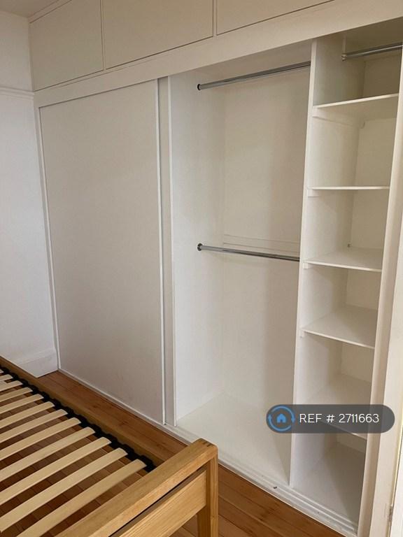 The property has original wooden floors, secondary glazing, electric blinds, and is located on the second floor of the building, with plenty of storage space, wardrobes and bed frame included.