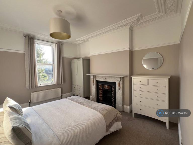 Bedroom: A light, well-proportioned bedroom featuring a king-sized bed, bedside table, wardrobe, chest of drawers, period fireplace, double-glazed window, and radiator.