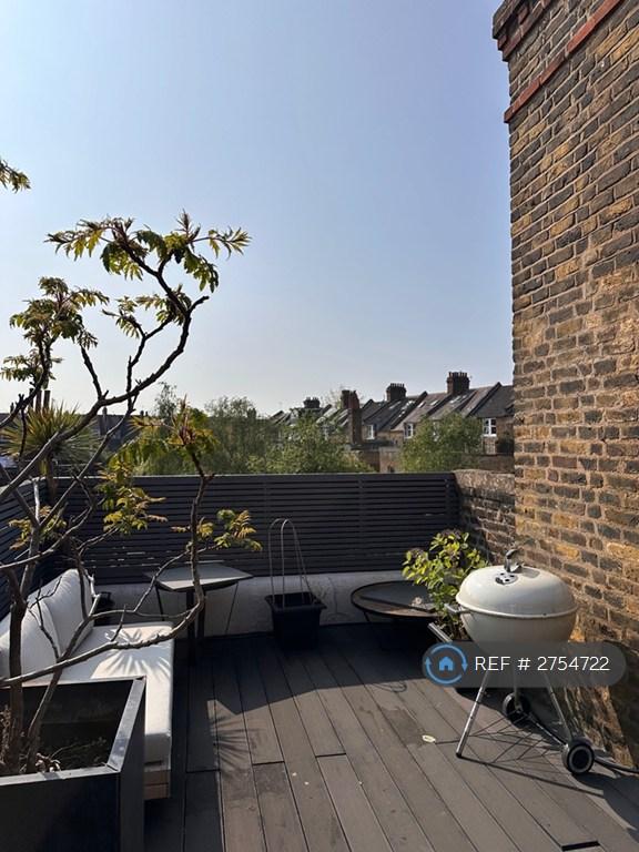 This NEW beautiful 1 bedroom apartment is on the 3rd floor of a stunning 4 story Victorian Town house. It does not have its own entrance but shares our front door and staircase. That means you have to walk thru our house to get to the upstairs flat which is completely self contained with its own locked front door. We are a professional couple working in music and interior design. This 1 bed flat has an open plan kitchen lounge with washing machine, fridge and microwave. The large king bedroom has comfortable 180x 200 cm bed , large wardrobe and the shower room has a large modern walk in shower . You'll have sole access to a large sunny south facing roof terrace which has garden views and equipped with a sofa, bbq and planters, . The rooms are spacious and very bright with ample storage. The property is on a very quiet street and walking distance to Brondesbury Overground, Kilburn Jubilee Line. All bills are included. We're also walking distance to the amenities of Queens Park.