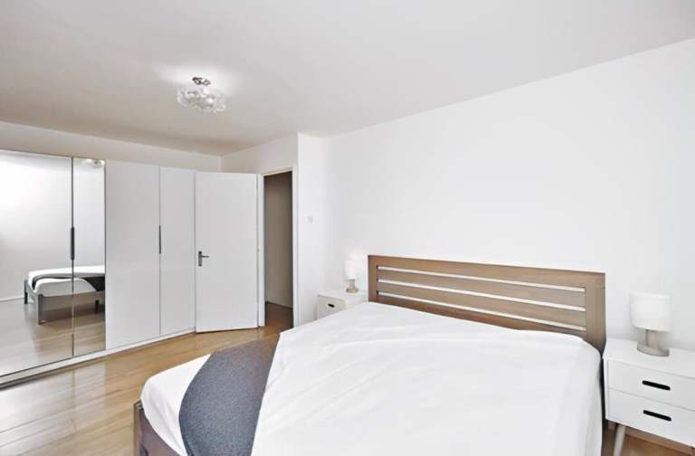 The bedroom continues the theme of brightness and warmth, featuring built-in mirrored wardrobes and a large window offering pleasant views. The bathrooms showcase contemporary design elements, featuring a tiled shower area and stylish floor tiles in earthy tones.