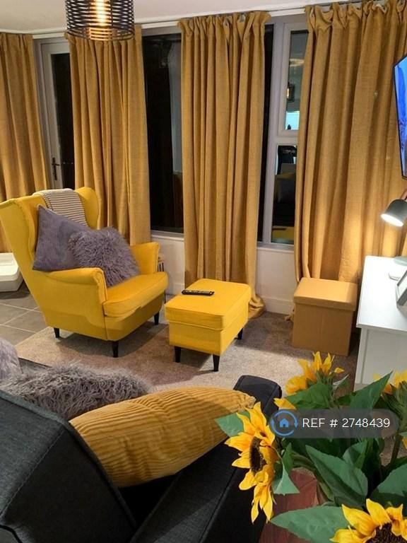 The property is ground floor and has a large sitting/dining room with windows and doors overlooking the communal garden. There is a large smart TV, sofa, chair and a dining table and chairs. There is also a dedicated workspace with a desk and chair for anyone studying from the apartment.
