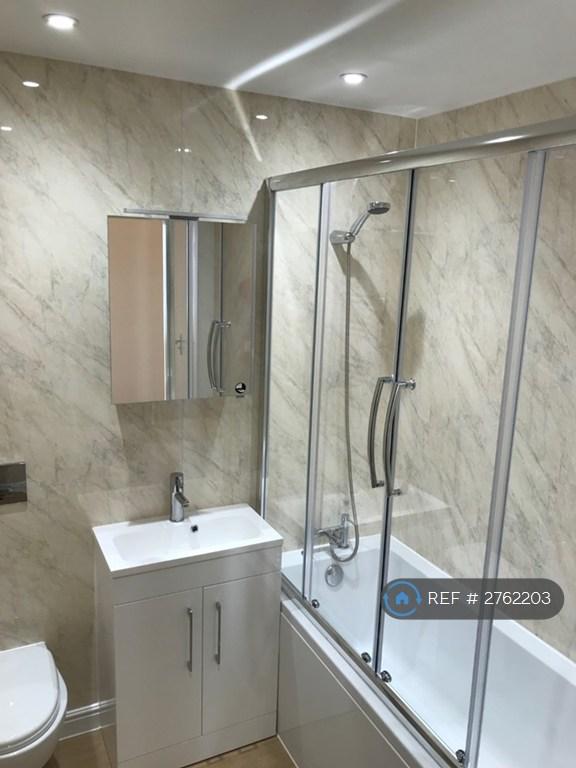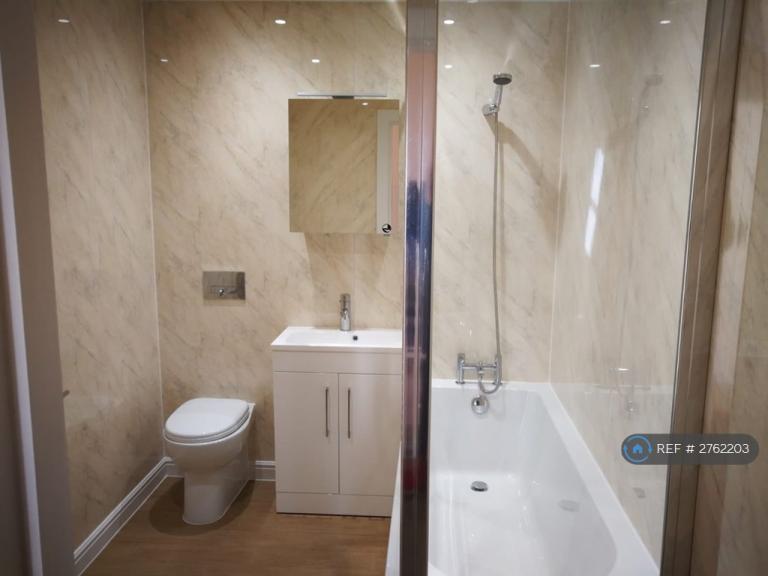 One oversized double bedroom has a mirrored wardrobe and night storage heater and the good size bathroom with shower over the bath and storage cupboard.
