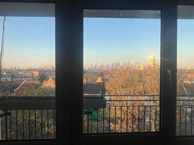 A large living room with a balcony and views of Canary Wharf (the sunsets are amazing!)