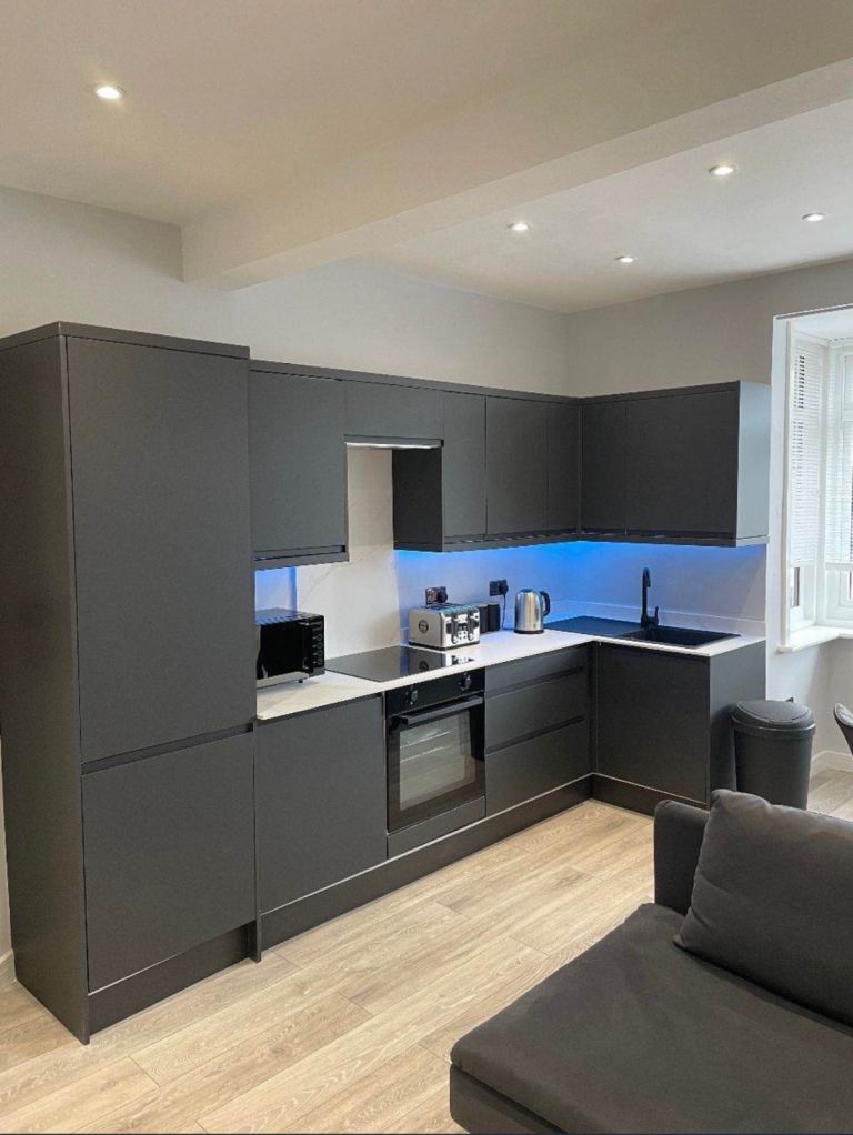 The property is finished to a high standard throughout and offers a bright, open-plan living space with contemporary furnishings, creating a comfortable and stylish home. The modern kitchen is fully equipped, and the generously sized bedroom comes furnished with quality furniture. A sleek, well-presented bathroom completes the flat.
