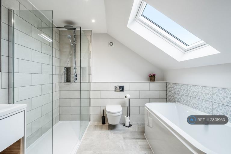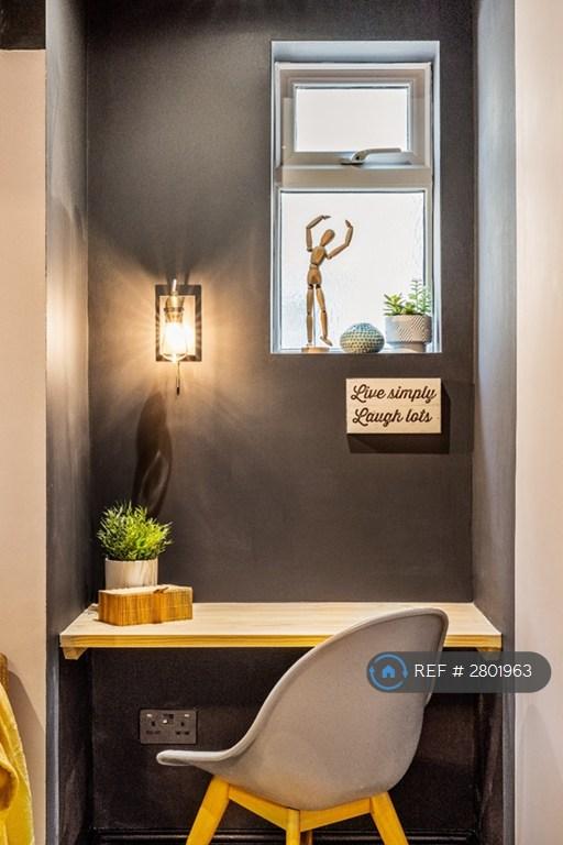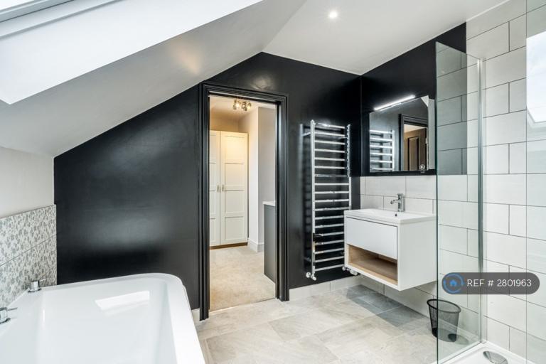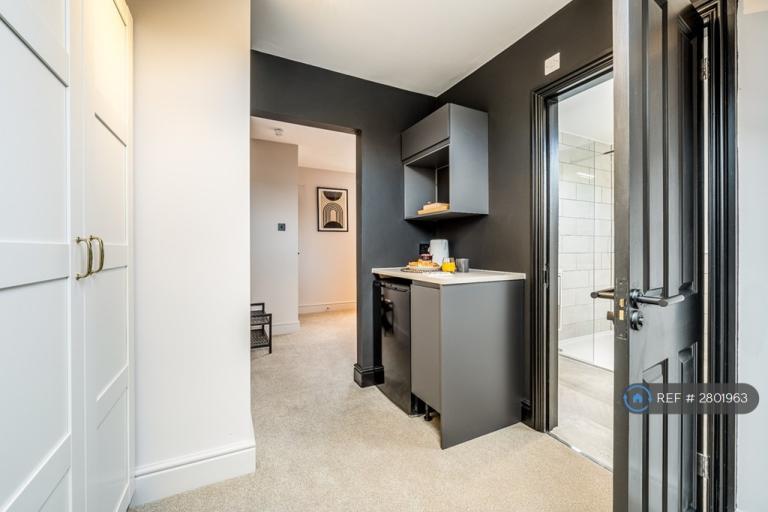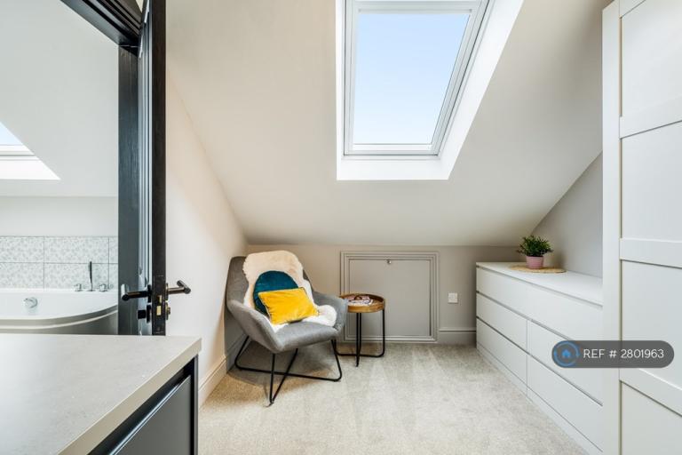 A spacious loft bedroom featuring a tea station with a fridge, walk-in wardrobe, large ensuite bathroom with walk-in shower and deep soak bathtub, and ample storage space. This stunning, luxurious boutique house-share has been recently refurbished to the highest standards with top-quality furnishings and fittings.Â