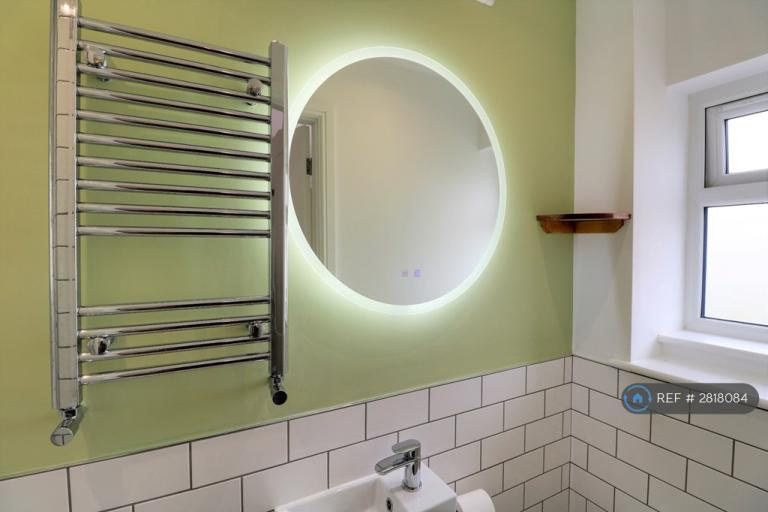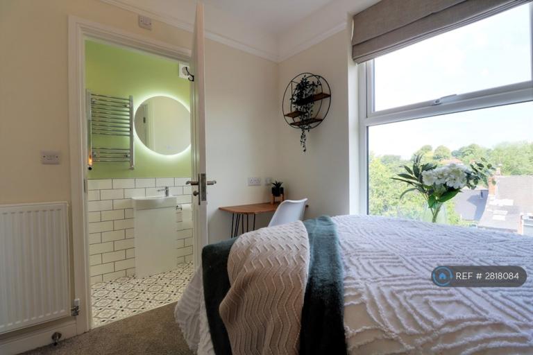 A stunning newly refurbished small double bedroom with a small double (3/4) bed and desk/study area. En suite shower room with WC, shower cubicle and sink.