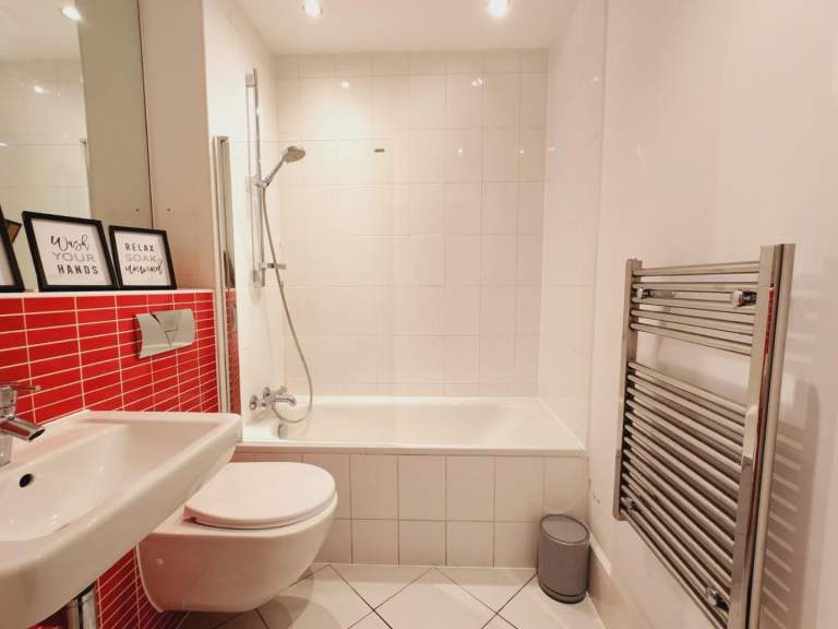 Large windows fill the apartment with natural light, creating a spacious and welcoming atmosphere. The bathroom is finished to a high standard with modern fittings, and the building benefits from secure entry and well-maintained communal areas.