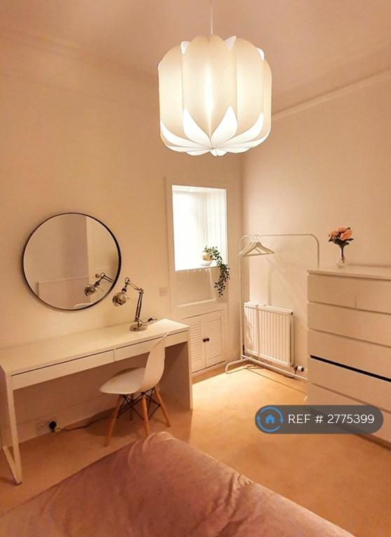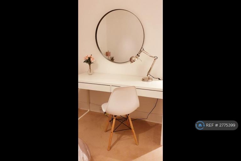 Bedroom 2 includes a small double bed, desk with chair, chest of drawers, storage unit and a mirror. There is a walkin cupboard next door with can be used a wardrobe. The window has a black out blind.