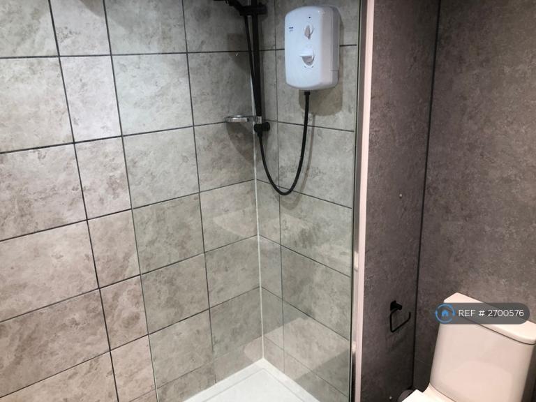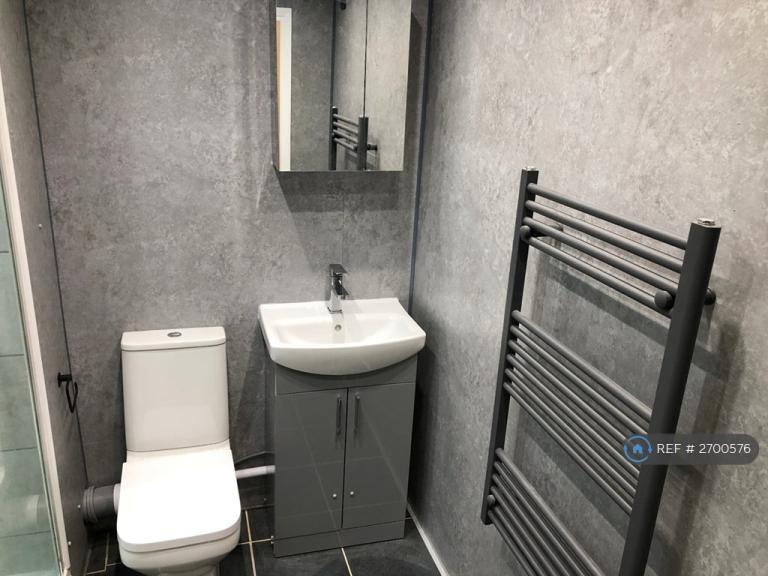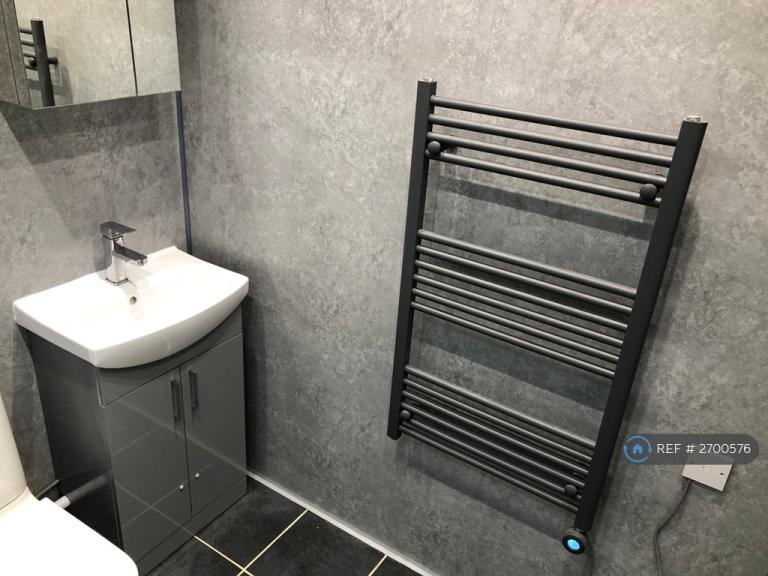 Bathroom newly fitted with concrete Grey pvc panels, generous size walk-in shower, new toilet and sink vanity unit, with stainless steel bathroom cabinet. Electric heated grey Towel Rail.