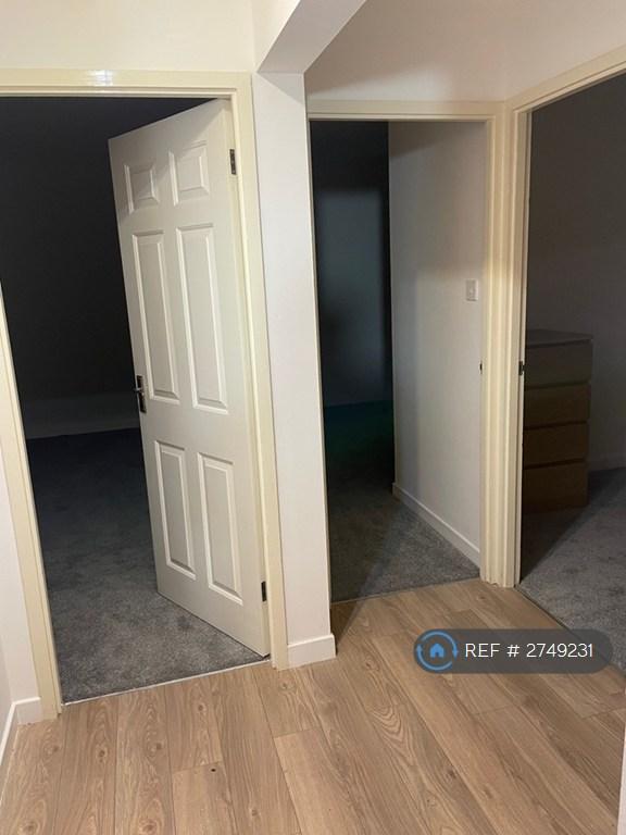 Laminated flooring with two store cupboards, one housing the hot water tank, and doors to principal rooms.