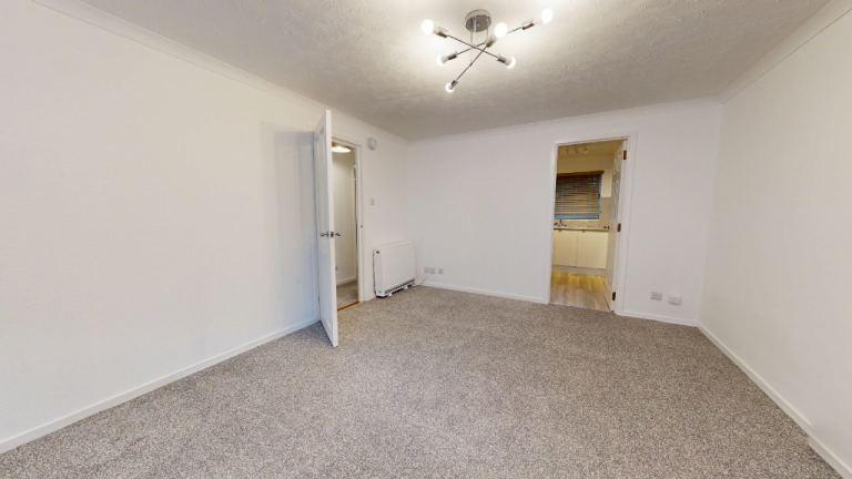 The living room is generously sized, with plush carpeting and a modern light fixture, creating a comfortable area for relaxation or entertaining. Both bedrooms are carpeted and offer ample space, with one room featuring a large window overlooking greenery. The bathroom is efficiently designed with a shower-over-bath configuration, modern fixtures, and partial tiling.