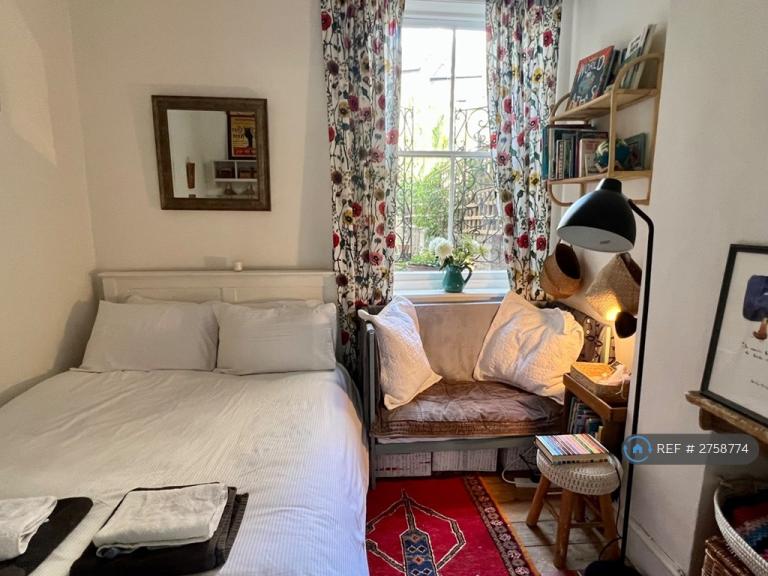 Large sunny bedroom with king size bed and another double room. Living room with bay windows to the leafy garden. Small and cosy but very well equipped kitchen leading to quiet bathroom at rear with bath, lovely and peaceful listening to the birds in the garden. Small terraced garden to the rear with outdoor seating.