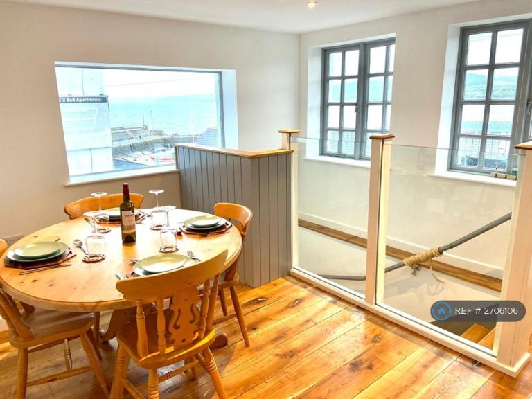 Stunning seaside furnished short term let serviced accommodation - Two double bedrooms, apartment is overlooking the main sandy beach and harbour in New Quay with large outside balcony. Both double bedrooms are fitted with built in cupboards Max occupancy 4 persons. Large open plan living and kitchen area. Study work space. Close to shops and amenities - spectacular views overlooking bay. Not suitable for babies/young children. Access via a flight of stairs. No smoking. Min term per booking 28 nights. Incs all bills ex electric usage. Available end Nov £500.00 breakages deposit for 28 day stay. £400 per week (inc all bills ex electric) - optional additional charges for cleaning/bed linen/towels per week if