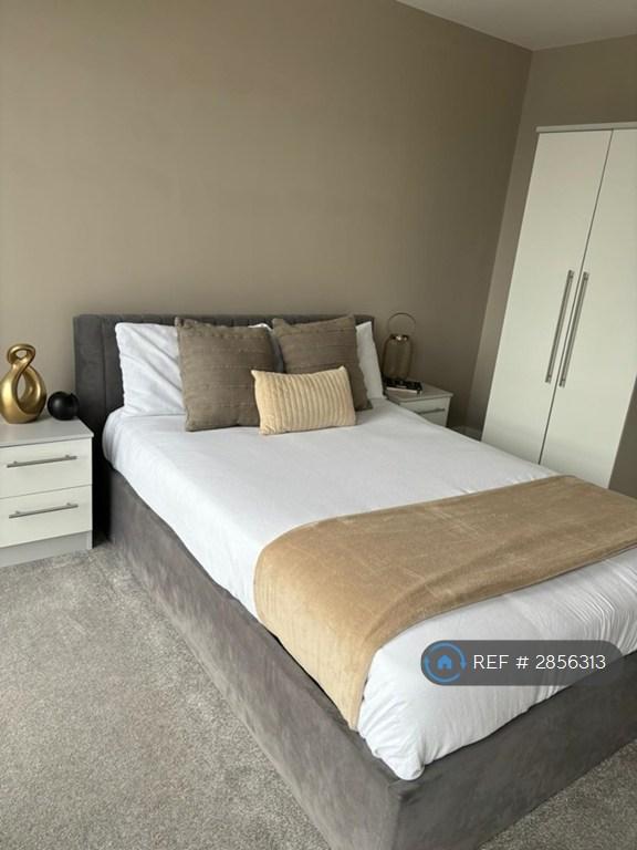 The master bedroom includes a double bed and a spacious wardrobe, along with an en-suite bathroom. The second bedroom has a double bed and ample storage space.