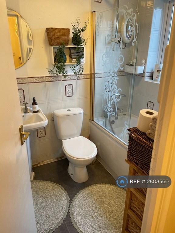 Bathroom: white three-piece suite with shower attachment and heated towel rail