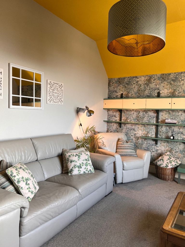Living room with leather sofa, coffee table, and a working desk - ideal for working from home.