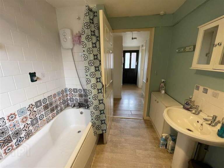 White three piece suite with electric shower over the bath. Vinyl flooring. Part tiled walls. 1 x Double radiator.