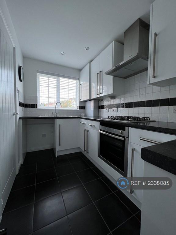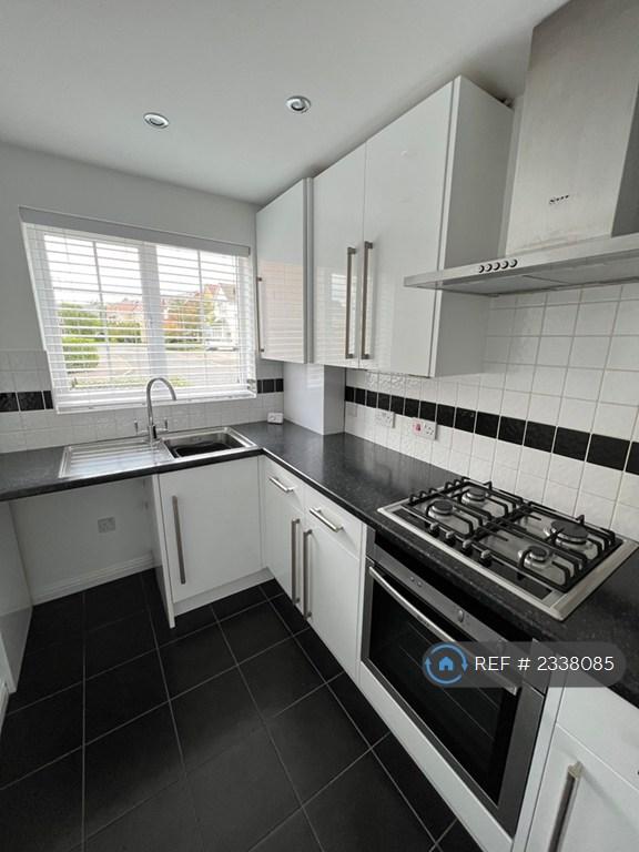KITCHEN - 10"3" X 5'10" - Symphony white gloss kitchen wall and base cupboards, with black worktop and stainless steel sink. Downlights. Integrated Neff oven and gas hob, extractor fan. Space for washing machine and fridge/freezer. Tiling to walls and floor. Newly fitted Worcester Bosch combi boiler installed 2023.