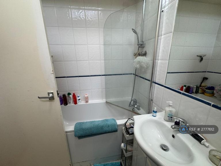 * Bathroom: Shower over bath, tiled walls/floor, basin with cabinet