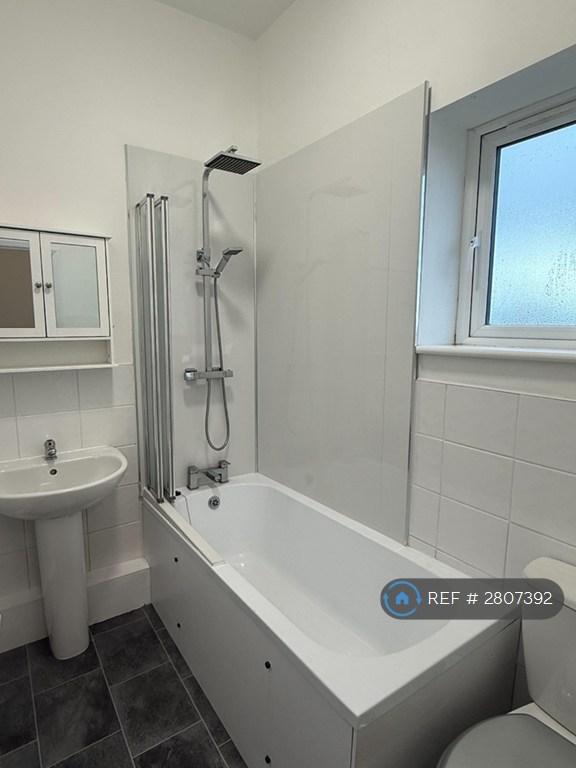 Bathroom comprising: Bath with dual-head shower over off the boiler, W.C. wall mounted vanity unit.