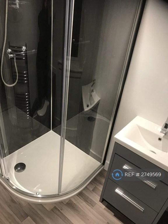 The shower room includes a large shower with modern wetwall, stylish vanity furniture, modern heated towel rail and wall mounted mirror.