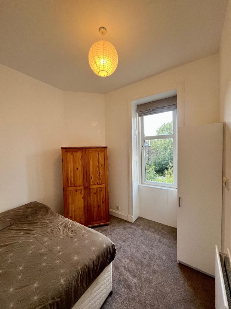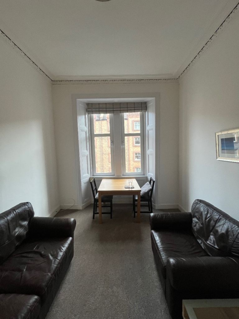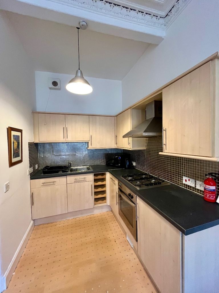 Spacious second floor furnished flat in a traditional tenement building with gas central heating and Double Glazing. The accommodation comprises a spacious kitchen/living room with washing machine fridge, oven and 4 gas ring hob and hood. Kitchen is fitted with wall, floor units and linoleum flooring.
