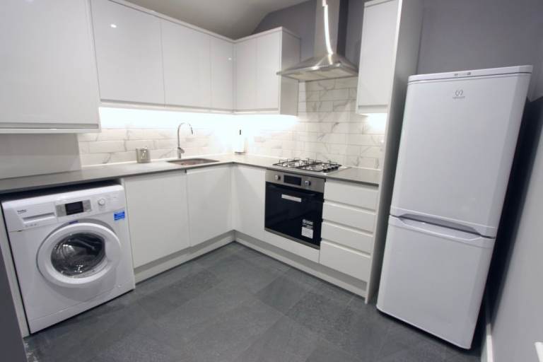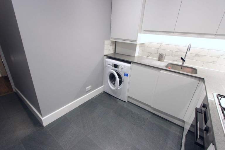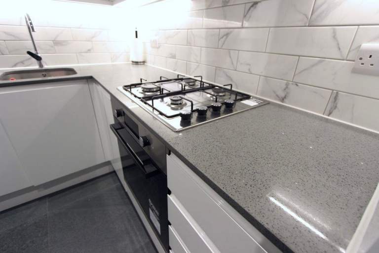 OPEN PLAN, Fully fitted kitchen with gas hob, fridge freezer, washing machine with a quartz Worktop