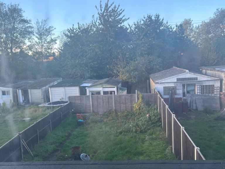 Very large back garden with side entrance in the front. Large front patio with parking space up to 2-3 cars.