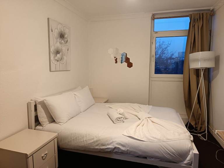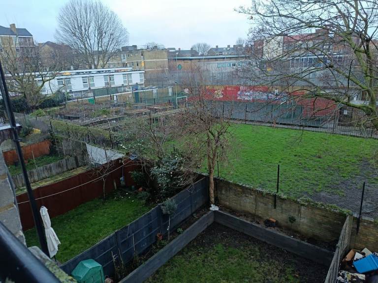 Sunny upper maisonette with two floors, 5 mins walk to Brick Lane and the bus stops on Bethnal Green Road, 10 mins walk to Columbia Flower Market, 18 mins walk to Liverpool Street Station. Parking available upon application for residents. 3 bedrooms and a living room with balcony overlooking allotments. Furnished.