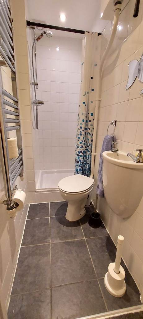 Two double bedrooms upstairs, one with a king size bed and the third has two single beds. Upstairs there is a bathroom with bath and power shower; downstairs has a shower room with toilet and basin.