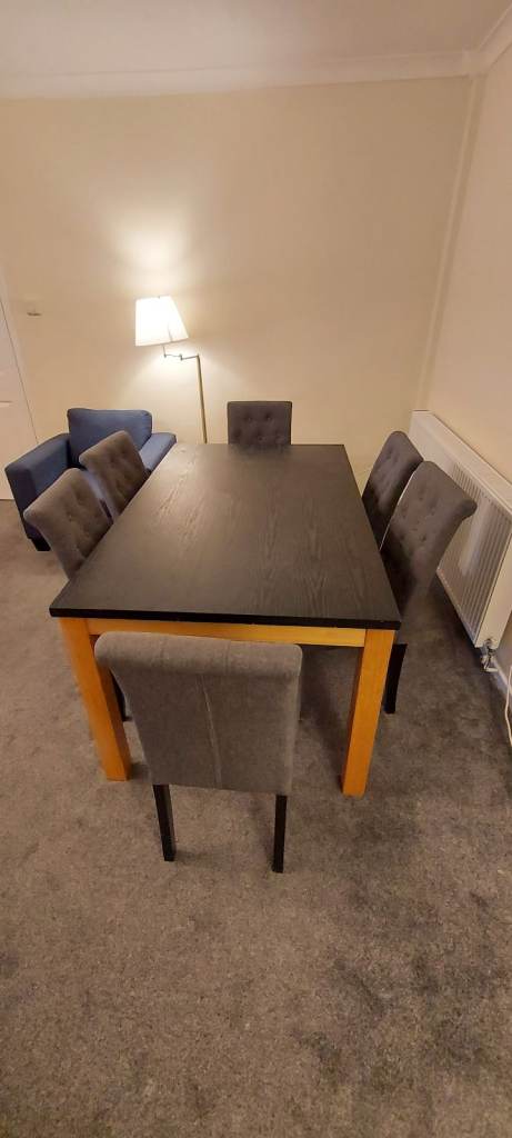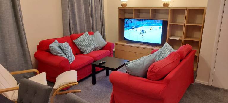Living room has two sofas, dining table for 6 and a 39 inch smart TV with free view.