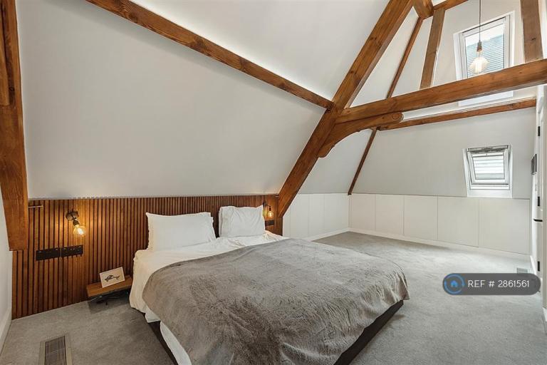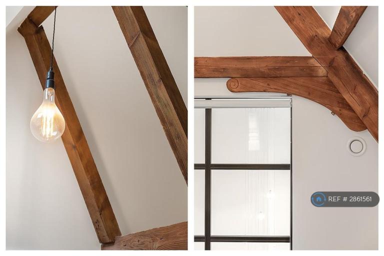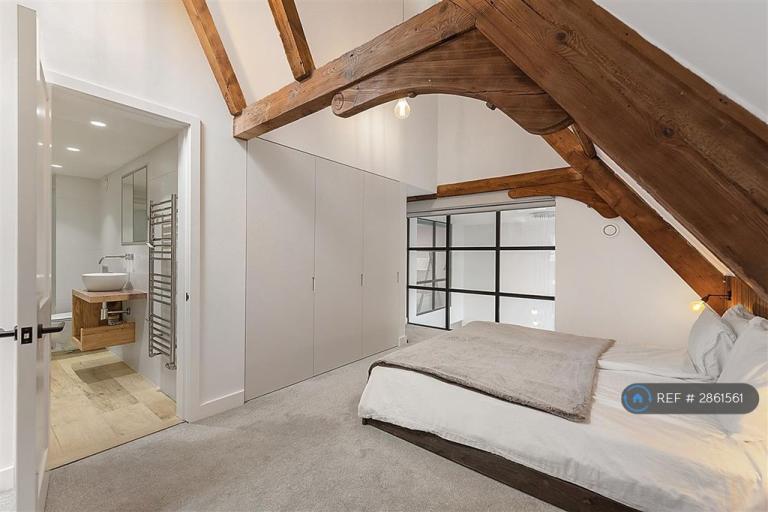 Over the upper floors, there are three double bedrooms, two bathrooms and a large terrace with skyline views. The master bedroom is situated on the middle floor and boasts a double height ceiling with the original renovated beams, crittal-style interior windows along with an en-suite bathroom. Storage is ample with three banks of fitted wardrobes plus eave storage.