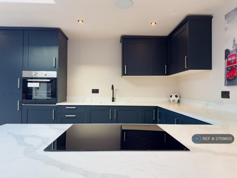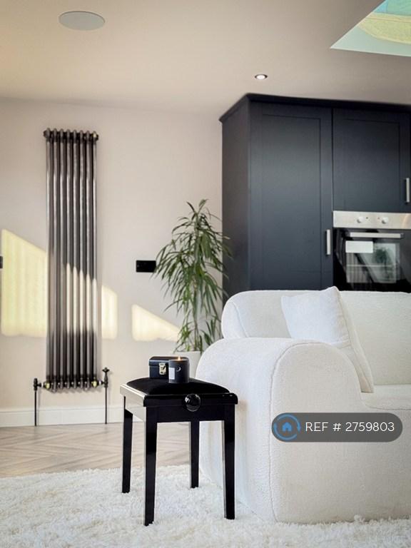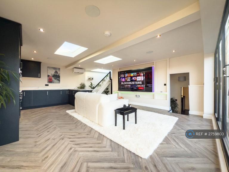 The bespoke kitchen is both stylish and functional, featuring sleek modern cabinetry, integrated appliances and elegant work surfaces, perfectly suited to both everyday living and entertaining. The adjoining living space is centred around a striking 100-inch television with Sonos surround sound, delivering a true cinematic experience within the comfort of your own home.