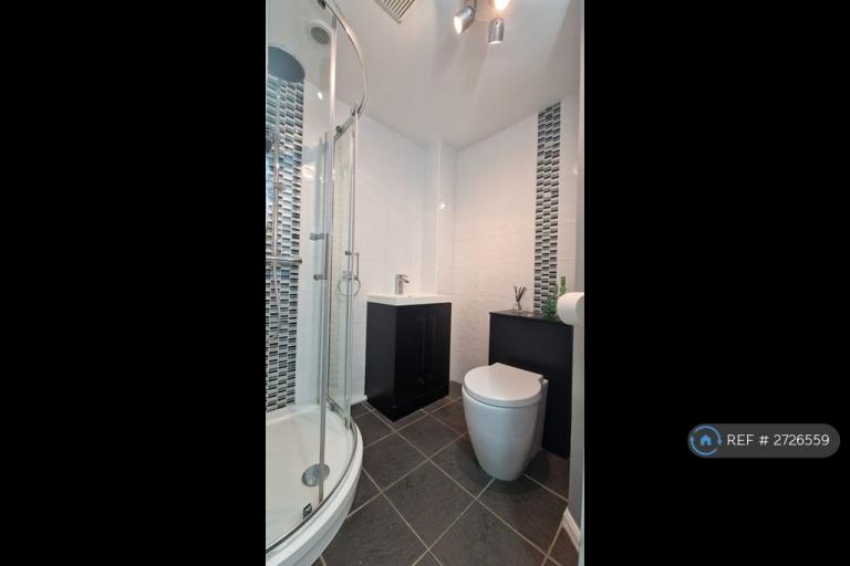 Bathroom: 7'7" x 6'3" Low level WC, sink with built in vanity unit for storage, tiled walls, stand in shower cubicle, radiator.