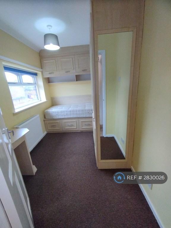 A good sized single bedroom at the front of the property with a range of fitted wardrobes and desk unit, carpeted, radiator.