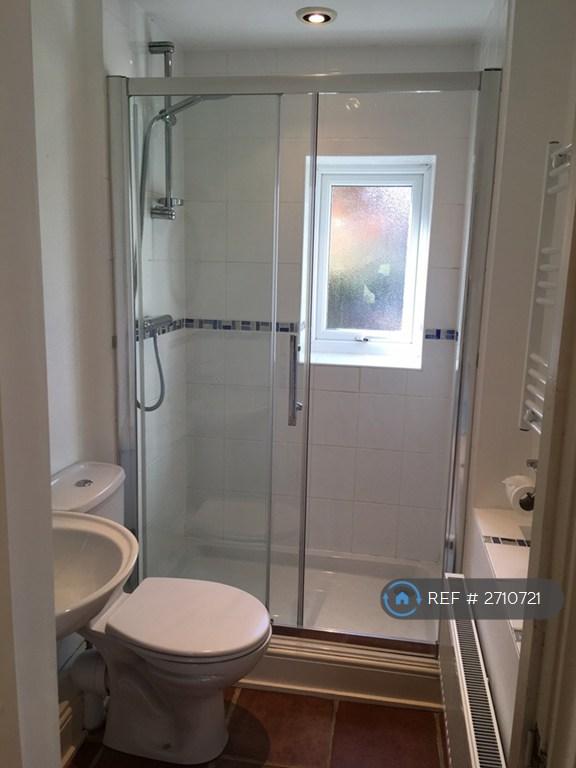 Shower room: large shower cubicle with sliding glass doors, thermostatic shower, handbasin, WC, ceiling extractor fan, heated towel rail