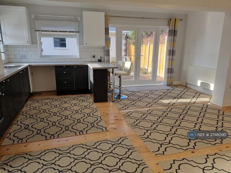 The contemporary open plan kitchen diner/family room has grey kitchen units, breakfast bar, fitted cooker and hob with space for appliances. This bright and spacious room  is ideal for family living, with patio doors opening out onto the decking and back garden. There is ample room for a dining room table and settee. Â