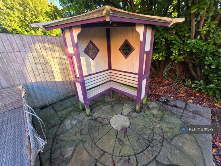 Outside, you'll find a large rear garden with decking and built-in seating, perfect for relaxing or hosting gatherings. There is also a front garden, private driveway, and a practical outhouse offering additional storage.