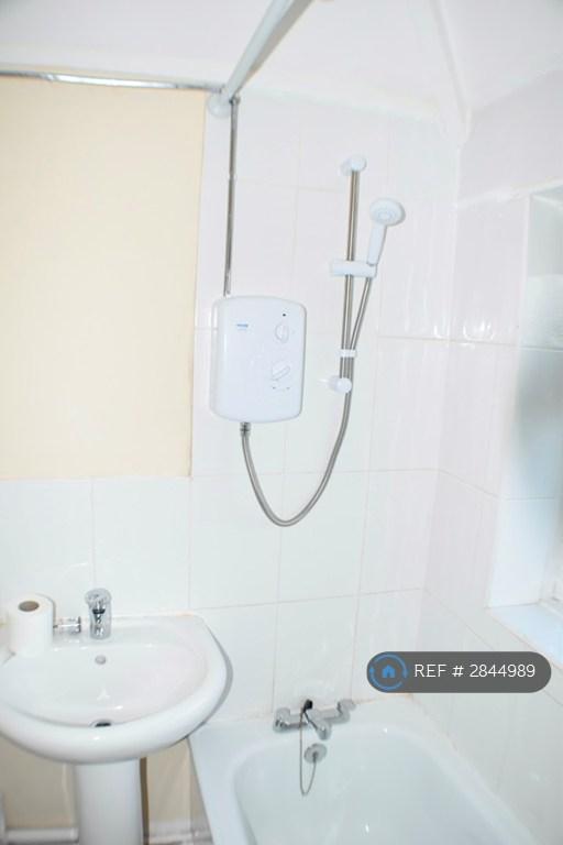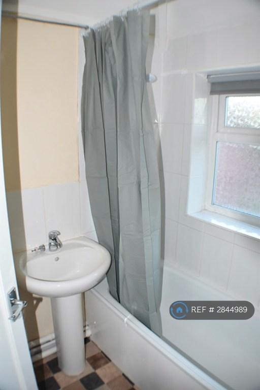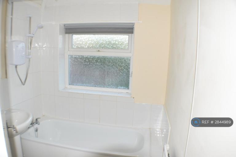 Bathroom white suite with electric shower, shower curtain, double glazed window overlooking the rear garden, vinyl floor
