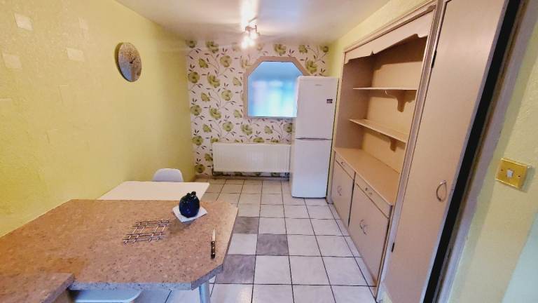 Single drainer stainless steel sink unit, range of high and low level units, formica worktops, cooker space, extractor fan, plumbed for washing machine, tumble dryer space, fridge/freezer space.