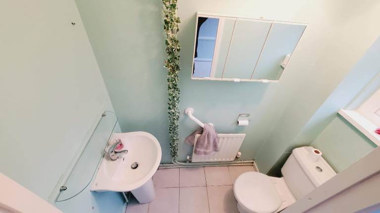 White suite comprising panelled bath, electric shower, pedestal wash hand basin, low flush wc, fully tiled walls, double panelled radiator.