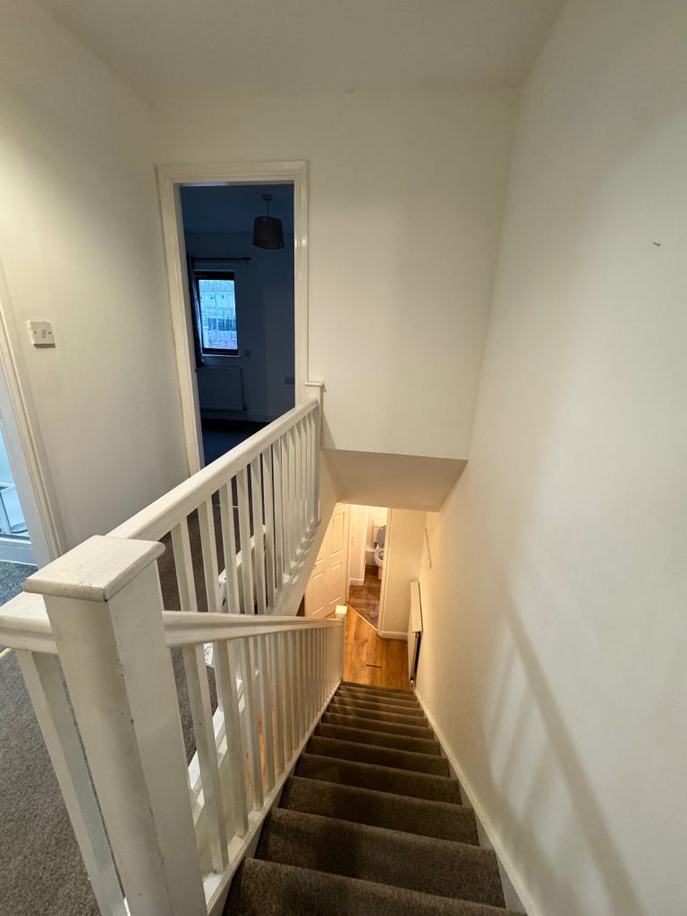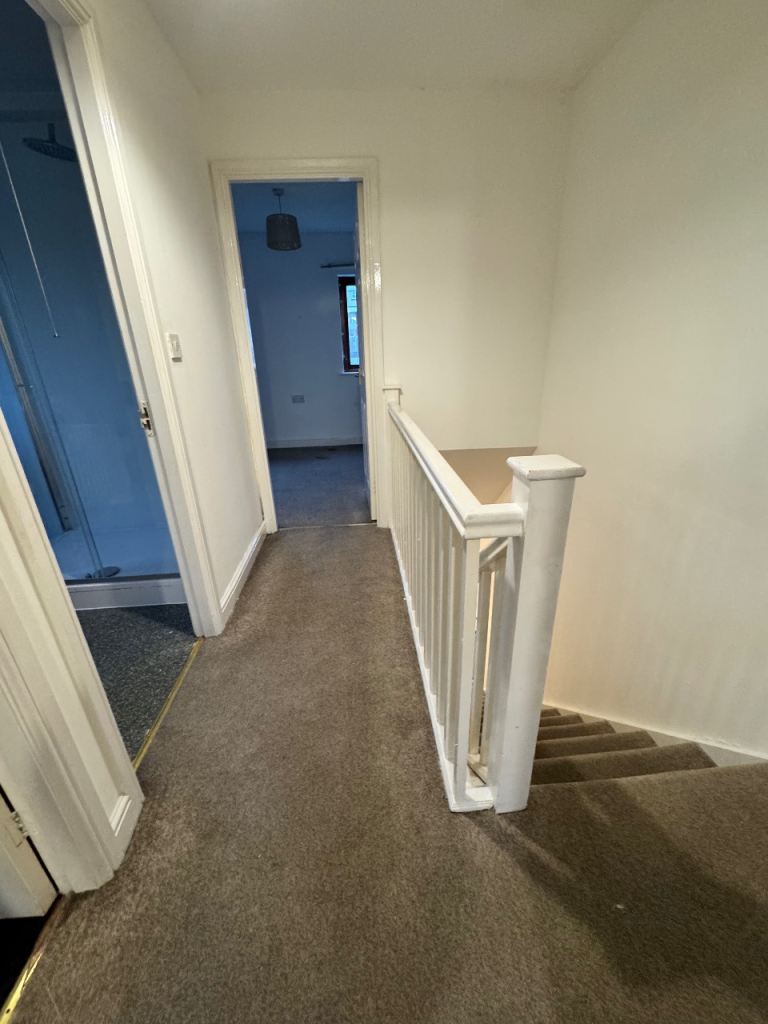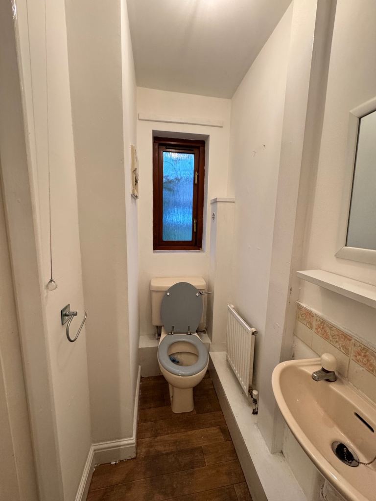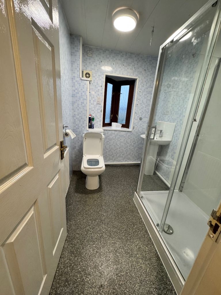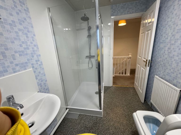 The family bathroom has been upgraded, with the bath replaced by a modern walk-in shower, along with a low flush WC and wash hand basin, creating a stylish and practical space.