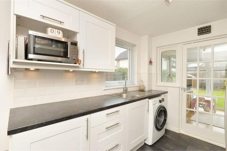 Fully fitted open-plan kitchen benefits from ample cupboard space, cooker, oven, washer dryer, fridge freezer, cooker hood