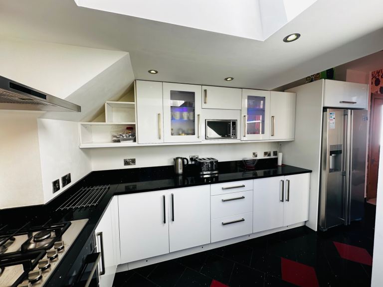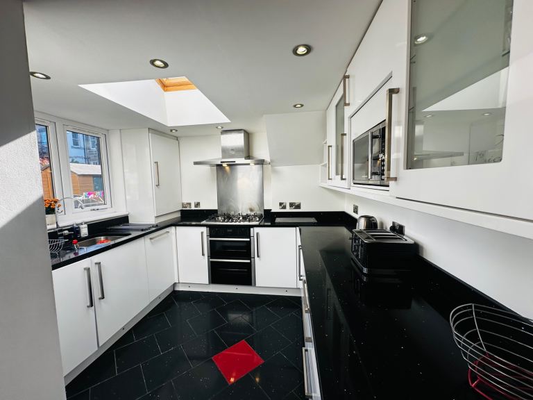 DECORATIVE CORNICE WORKS THROUGHOUT LIVING GAS FIRE NATURAL SANDED FLOORS THROUGHOUT MASTER BEDROOM WITH EN-SUITE FULLY FURNISHED WITH ALL EQUIPMENTS BEDS WARDROBES CHEST DRAWERS LARGE FULLY FITTED KITCHEN WITH BUILT IN APPLIANCES SOLID BLACK GRANITE WORKTOPS WASHING MACHINE DISHWASHER AMERICAN FRIDGE FREEZER UNDER FLOOR HEATING IN AREAS GAS CENTRAL HEATING THROUGHOUT DOUBLE GLAZED WINDOWS THROUGHOUT REAR PRIVATE GARDEN PRIVATE FRONT GARDEN.
