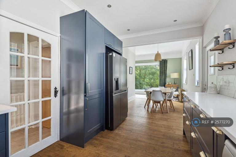 The formal lounge is bright and inviting, featuring a dramatic gable-end window and a stylish log-burning stove. It flows seamlessly into the open-plan dining area, creating an ideal setting for entertaining. The newly fitted kitchen includes a full range of contemporary wall and base units with contrasting worktops and splashbacks, and opens directly onto the rear courtyard-style garden.
